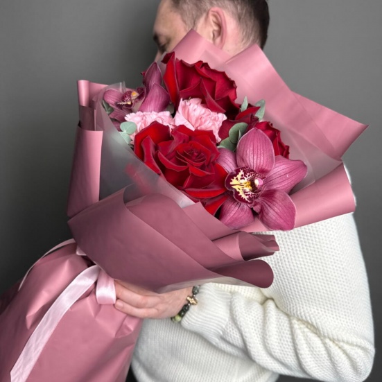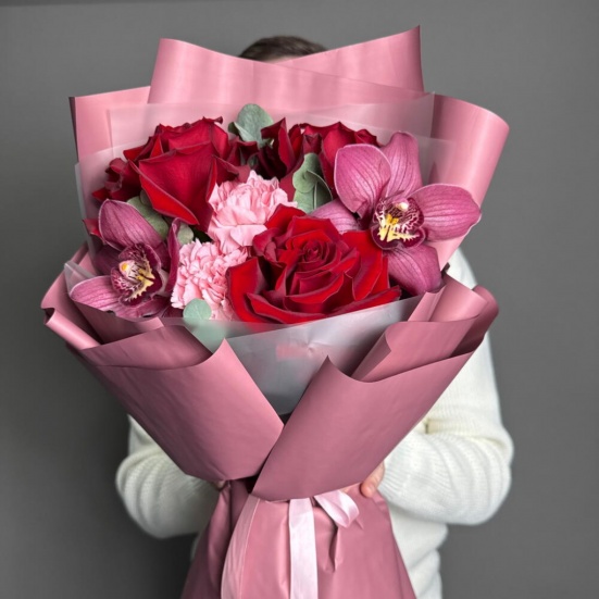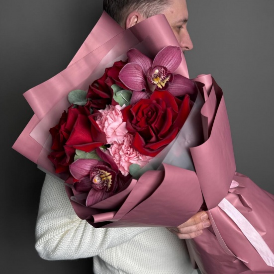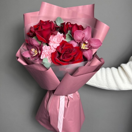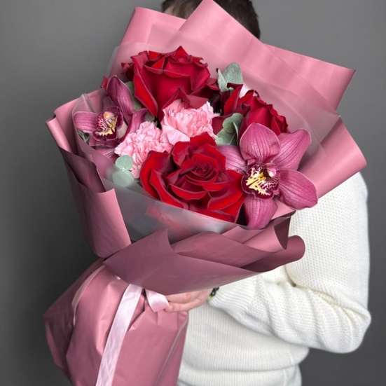 Букет из 3 красных роз, орхидей и диантуса в Кемерово