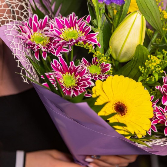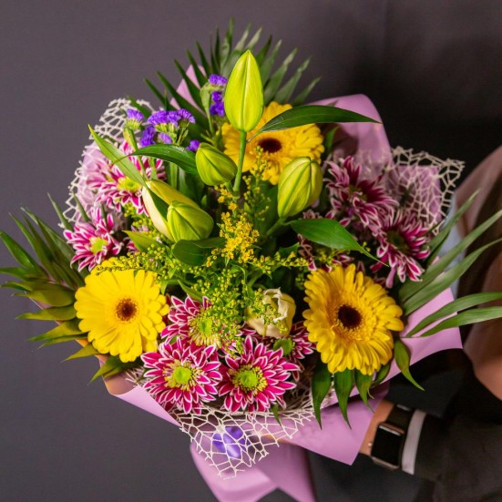 Букет с розами, хризантемами, лилиями, герберами в Кемерово