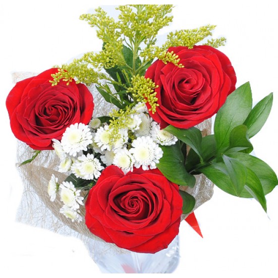 Букет «3 красных роз и 2 белых хризантем» в Кемерово